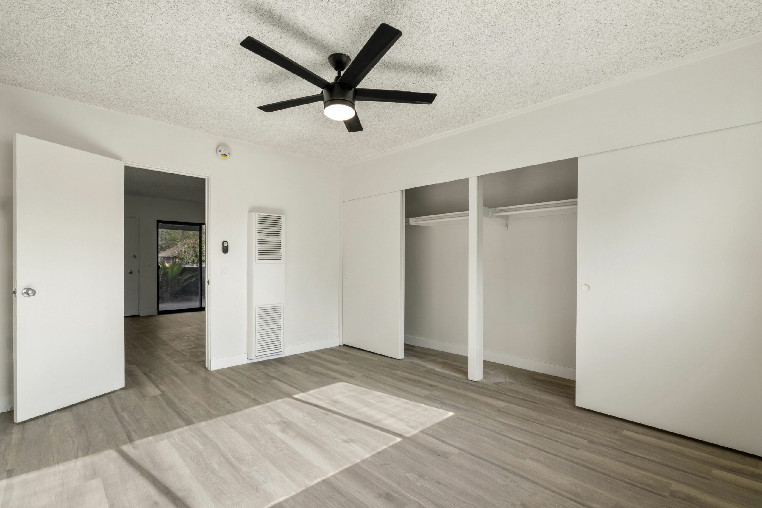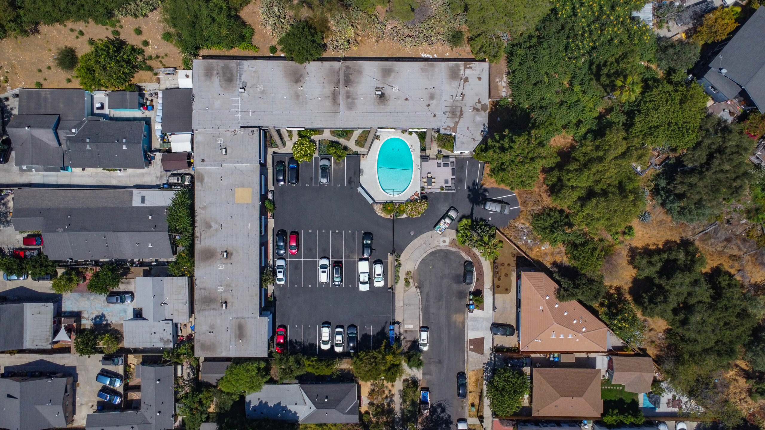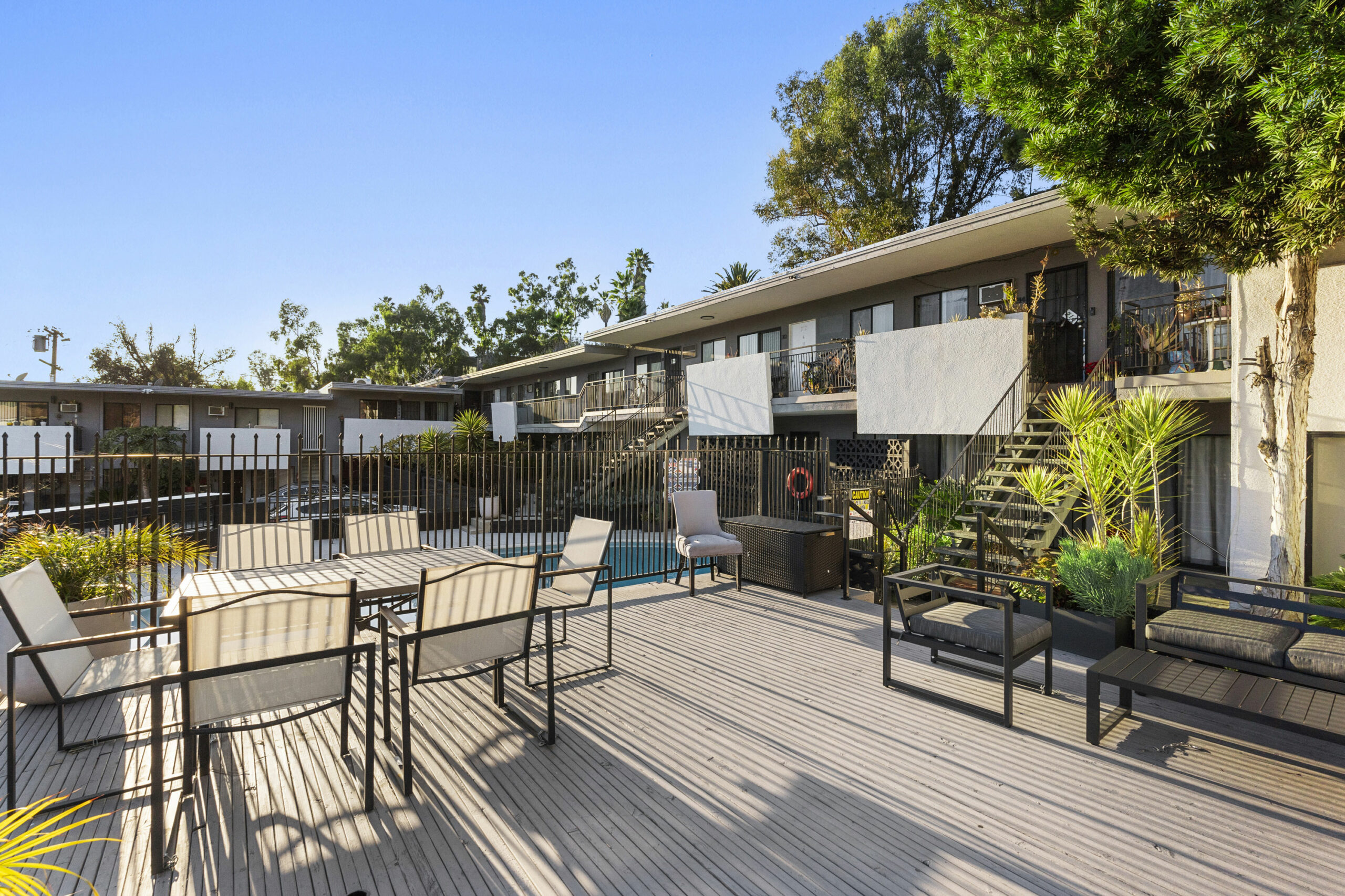 • Charming, well-maintained mid-century courtyard-style building w/ cool Palm Springs vibes on a cul-de-sac at the top of a tree-lined street of primarily single-family homes